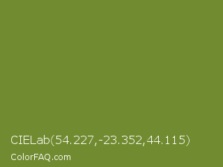 CIELab 54.227,-23.352,44.115 Color is a normal lime color and the nearest color is Wasabi #788a25. Hex code #718b30 and RGB value is rgb(113,139,48). In RGB color space, this color is composed of 44% red, 55% green, 19% blue, In CMYK color space, this color is composed of 19% cyan, 0% magenta, 65% yellow , 45% black , In HSL color space, this color has a hue angle of 77° , 49% saturation and 37% lightness.