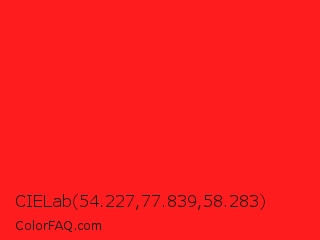 CIELab 54.227,77.839,58.283 Color is a normal red color and the nearest color is Red RYB #fe2712. Hex code #ff1c1f and RGB value is rgb(255,28,31). In RGB color space, this color is composed of 100% red, 11% green, 12% blue, In CMYK color space, this color is composed of 0% cyan, 89% magenta, 88% yellow , 0% black , In HSL color space, this color has a hue angle of 359° , 100% saturation and 55% lightness.