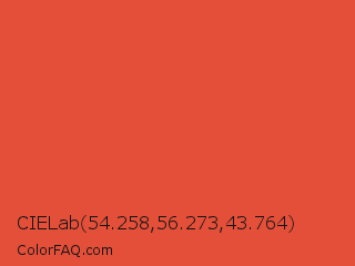 CIELab 54.258,56.273,43.764 Color is a normal red color and the nearest color is Carmine Pink #eb4c42. Hex code #e34f39 and RGB value is rgb(227,79,57). In RGB color space, this color is composed of 89% red, 31% green, 22% blue, In CMYK color space, this color is composed of 0% cyan, 65% magenta, 75% yellow , 11% black , In HSL color space, this color has a hue angle of 8° , 75% saturation and 56% lightness.