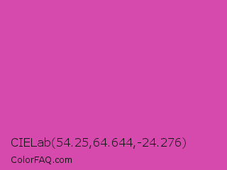 CIELab 54.25,64.644,-24.276 Color is a normal magenta color and the nearest color is Raspberry Pink #e25098. Hex code #d64aad and RGB value is rgb(214,74,173). In RGB color space, this color is composed of 84% red, 29% green, 68% blue, In CMYK color space, this color is composed of 0% cyan, 65% magenta, 19% yellow , 16% black , In HSL color space, this color has a hue angle of 318° , 63% saturation and 56% lightness.