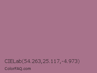 CIELab 54.263,25.117,-4.973 Color is a normal rose color and the nearest color is Turkish Rose #b57281. Hex code #a8728b and RGB value is rgb(168,114,139). In RGB color space, this color is composed of 66% red, 45% green, 55% blue, In CMYK color space, this color is composed of 0% cyan, 32% magenta, 17% yellow , 34% black , In HSL color space, this color has a hue angle of 332° , 24% saturation and 55% lightness.