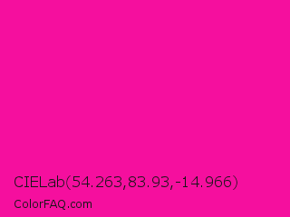 CIELab 54.263,83.93,-14.966 Color is a normal magenta color and the nearest color is Hollywood Cerise #f400a1. Hex code #f50f9e and RGB value is rgb(245,15,158). In RGB color space, this color is composed of 96% red, 6% green, 62% blue, In CMYK color space, this color is composed of 0% cyan, 94% magenta, 36% yellow , 4% black , In HSL color space, this color has a hue angle of 323° , 92% saturation and 51% lightness.