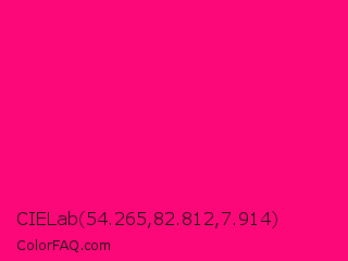 CIELab 54.265,82.812,7.914 Color is a normal rose color and the nearest color is Winter Sky #ff007c. Hex code #fc0878 and RGB value is rgb(252,8,120). In RGB color space, this color is composed of 99% red, 3% green, 47% blue, In CMYK color space, this color is composed of 0% cyan, 97% magenta, 52% yellow , 1% black , In HSL color space, this color has a hue angle of 332° , 98% saturation and 51% lightness.