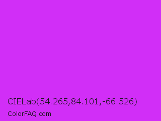 CIELab 54.265,84.101,-66.526 Color is a normal purple color and the nearest color is Steel Pink #cc33cc. Hex code #d12ef7 and RGB value is rgb(209,46,247). In RGB color space, this color is composed of 82% red, 18% green, 97% blue, In CMYK color space, this color is composed of 15% cyan, 81% magenta, 0% yellow , 3% black , In HSL color space, this color has a hue angle of 289° , 93% saturation and 57% lightness.