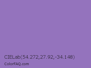 CIELab 54.272,27.92,-34.148 Color is a normal violet color and the nearest color is Wisteria #9771b5. Hex code #9473bd and RGB value is rgb(148,115,189). In RGB color space, this color is composed of 58% red, 45% green, 74% blue, In CMYK color space, this color is composed of 22% cyan, 39% magenta, 0% yellow , 26% black , In HSL color space, this color has a hue angle of 267° , 36% saturation and 60% lightness.