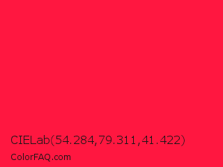 CIELab 54.284,79.311,41.422 Color is a normal red color and the nearest color is Torch Red #fd0e35. Hex code #ff1740 and RGB value is rgb(255,23,64). In RGB color space, this color is composed of 100% red, 9% green, 25% blue, In CMYK color space, this color is composed of 0% cyan, 91% magenta, 75% yellow , 0% black , In HSL color space, this color has a hue angle of 349° , 100% saturation and 55% lightness.
