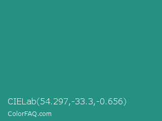 CIELab 54.297,-33.3,-0.656 Color is a normal cyan color and the nearest color is Lochinvar #2c8c84. Hex code #259182 and RGB value is rgb(37,145,130). In RGB color space, this color is composed of 15% red, 57% green, 51% blue, In CMYK color space, this color is composed of 74% cyan, 0% magenta, 10% yellow , 43% black , In HSL color space, this color has a hue angle of 172° , 59% saturation and 36% lightness.