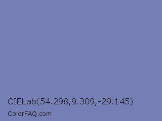 CIELab 54.298,9.309,-29.145 Color is a normal blue color and the nearest color is Wild Blue Yonder #7a89b8. Hex code #757fb4 and RGB value is rgb(117,127,180). In RGB color space, this color is composed of 46% red, 50% green, 71% blue, In CMYK color space, this color is composed of 35% cyan, 29% magenta, 0% yellow , 29% black , In HSL color space, this color has a hue angle of 230° , 30% saturation and 58% lightness.