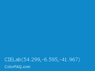 CIELab 54.299,-6.595,-41.967 Color is a normal blue color and the nearest color is Cyan Cornflower Blue #188bc2. Hex code #0f89ca and RGB value is rgb(15,137,202). In RGB color space, this color is composed of 6% red, 54% green, 79% blue, In CMYK color space, this color is composed of 93% cyan, 32% magenta, 0% yellow , 21% black , In HSL color space, this color has a hue angle of 201° , 86% saturation and 43% lightness.