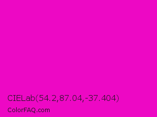 CIELab 54.2,87.04,-37.404 Color is a normal magenta color and the nearest color is Shocking Pink #fc0fc0. Hex code #ed08c4 and RGB value is rgb(237,8,196). In RGB color space, this color is composed of 93% red, 3% green, 77% blue, In CMYK color space, this color is composed of 0% cyan, 97% magenta, 17% yellow , 7% black , In HSL color space, this color has a hue angle of 311° , 93% saturation and 48% lightness.