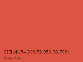 CIELab 54.306,52.859,38.708 Color is a normal red color and the nearest color is Flame Pea #da5b38. Hex code #de5442 and RGB value is rgb(222,84,66). In RGB color space, this color is composed of 87% red, 33% green, 26% blue, In CMYK color space, this color is composed of 0% cyan, 62% magenta, 70% yellow , 13% black , In HSL color space, this color has a hue angle of 7° , 70% saturation and 56% lightness.