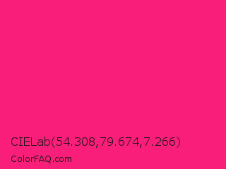 CIELab 54.308,79.674,7.266 Color is a normal rose color and the nearest color is Razzmatazz #e3256b. Hex code #f81e79 and RGB value is rgb(248,30,121). In RGB color space, this color is composed of 97% red, 12% green, 47% blue, In CMYK color space, this color is composed of 0% cyan, 88% magenta, 51% yellow , 3% black , In HSL color space, this color has a hue angle of 335° , 94% saturation and 55% lightness.