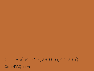 CIELab 54.313,28.016,44.235 Color is a normal orange color and the nearest color is Copper #b87333. Hex code #bf6d35 and RGB value is rgb(191,109,53). In RGB color space, this color is composed of 75% red, 43% green, 21% blue, In CMYK color space, this color is composed of 0% cyan, 43% magenta, 72% yellow , 25% black , In HSL color space, this color has a hue angle of 24° , 57% saturation and 48% lightness.