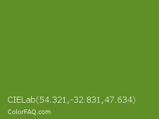 CIELab 54.321,-32.831,47.634 Color is a normal green color and the nearest color is Maximum Green #5e8c31. Hex code #608f27 and RGB value is rgb(96,143,39). In RGB color space, this color is composed of 38% red, 56% green, 15% blue, In CMYK color space, this color is composed of 33% cyan, 0% magenta, 73% yellow , 44% black , In HSL color space, this color has a hue angle of 87° , 57% saturation and 36% lightness.