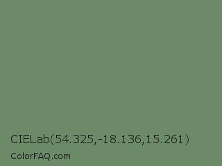 CIELab 54.325,-18.136,15.261 Color is a normal green color and the nearest color is Highland #6f8e63. Hex code #6b8a67 and RGB value is rgb(107,138,103). In RGB color space, this color is composed of 42% red, 54% green, 40% blue, In CMYK color space, this color is composed of 22% cyan, 0% magenta, 25% yellow , 46% black , In HSL color space, this color has a hue angle of 113° , 15% saturation and 47% lightness.