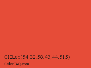 CIELab 54.32,58.43,44.515 Color is a normal red color and the nearest color is Cinnabar #e34234. Hex code #e64c38 and RGB value is rgb(230,76,56). In RGB color space, this color is composed of 90% red, 30% green, 22% blue, In CMYK color space, this color is composed of 0% cyan, 67% magenta, 76% yellow , 10% black , In HSL color space, this color has a hue angle of 7° , 78% saturation and 56% lightness.