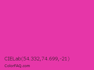 CIELab 54.332,74.699,-21 Color is a normal magenta color and the nearest color is Frostbite #e936a7. Hex code #e636a8 and RGB value is rgb(230,54,168). In RGB color space, this color is composed of 90% red, 21% green, 66% blue, In CMYK color space, this color is composed of 0% cyan, 77% magenta, 27% yellow , 10% black , In HSL color space, this color has a hue angle of 321° , 78% saturation and 56% lightness.