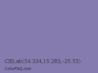 CIELab 54.334,15.283,-25.53 Color is a normal indigo color and the nearest color is Lavender Purple #967bb6. Hex code #867bae and RGB value is rgb(134,123,174). In RGB color space, this color is composed of 53% red, 48% green, 68% blue, In CMYK color space, this color is composed of 23% cyan, 29% magenta, 0% yellow , 32% black , In HSL color space, this color has a hue angle of 253° , 24% saturation and 58% lightness.