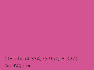 CIELab 54.334,56.957,-8.927 Color is a normal rose color and the nearest color is Pink Pantone #d74894. Hex code #d45393 and RGB value is rgb(212,83,147). In RGB color space, this color is composed of 83% red, 33% green, 58% blue, In CMYK color space, this color is composed of 0% cyan, 61% magenta, 31% yellow , 17% black , In HSL color space, this color has a hue angle of 330° , 60% saturation and 58% lightness.