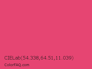 CIELab 54.338,64.51,11.039 Color is a normal rose color and the nearest color is Cabaret #d94972. Hex code #e64572 and RGB value is rgb(230,69,114). In RGB color space, this color is composed of 90% red, 27% green, 45% blue, In CMYK color space, this color is composed of 0% cyan, 70% magenta, 50% yellow , 10% black , In HSL color space, this color has a hue angle of 343° , 76% saturation and 59% lightness.