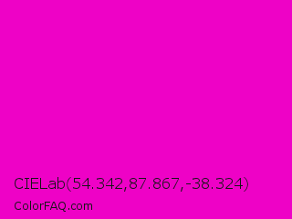 CIELab 54.342,87.867,-38.324 Color is a normal magenta color and the nearest color is Purple Pizzazz #ff00cc. Hex code #ee02c6 and RGB value is rgb(238,2,198). In RGB color space, this color is composed of 93% red, 1% green, 78% blue, In CMYK color space, this color is composed of 0% cyan, 99% magenta, 17% yellow , 7% black , In HSL color space, this color has a hue angle of 310° , 98% saturation and 47% lightness.