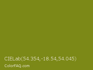 CIELab 54.354,-18.54,54.045 Color is a normal yellow color and the nearest color is Trendy Green #7c881a. Hex code #7d8916 and RGB value is rgb(125,137,22). In RGB color space, this color is composed of 49% red, 54% green, 9% blue, In CMYK color space, this color is composed of 9% cyan, 0% magenta, 84% yellow , 46% black , In HSL color space, this color has a hue angle of 66° , 72% saturation and 31% lightness.