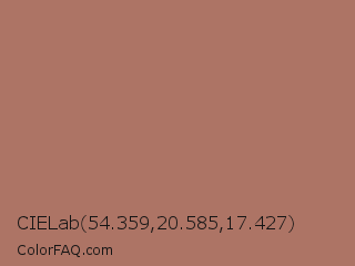 CIELab 54.359,20.585,17.427 Color is a normal red color and the nearest color is Copper Penny #ad6f69. Hex code #ad7465 and RGB value is rgb(173,116,101). In RGB color space, this color is composed of 68% red, 45% green, 40% blue, In CMYK color space, this color is composed of 0% cyan, 33% magenta, 42% yellow , 32% black , In HSL color space, this color has a hue angle of 13° , 31% saturation and 54% lightness.