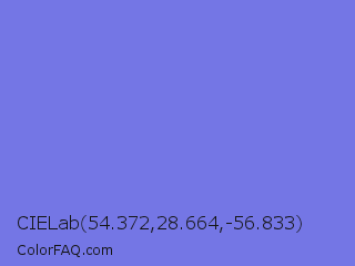 CIELab 54.372,28.664,-56.833 Color is a light blue color and the nearest color is Medium Slate Blue #7b68ee. Hex code #7476e5 and RGB value is rgb(116,118,229). In RGB color space, this color is composed of 45% red, 46% green, 90% blue, In CMYK color space, this color is composed of 49% cyan, 48% magenta, 0% yellow , 10% black , In HSL color space, this color has a hue angle of 239° , 68% saturation and 68% lightness.