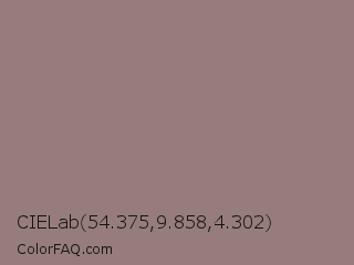 CIELab 54.375,9.858,4.302 Color is a normal red color and the nearest color is Bazaar #98777b. Hex code #967c7b and RGB value is rgb(150,124,123). In RGB color space, this color is composed of 59% red, 49% green, 48% blue, In CMYK color space, this color is composed of 0% cyan, 17% magenta, 18% yellow , 41% black , In HSL color space, this color has a hue angle of 2° , 11% saturation and 54% lightness.