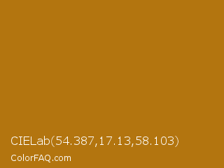 CIELab 54.387,17.13,58.103 Color is a normal orange color and the nearest color is Hot Toddy #b38007. Hex code #b3750f and RGB value is rgb(179,117,15). In RGB color space, this color is composed of 70% red, 46% green, 6% blue, In CMYK color space, this color is composed of 0% cyan, 35% magenta, 92% yellow , 30% black , In HSL color space, this color has a hue angle of 37° , 85% saturation and 38% lightness.