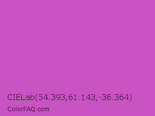 CIELab 54.393,61.143,-36.364 Color is a normal magenta color and the nearest color is Fuchsia Pink #c154c1. Hex code #c952c2 and RGB value is rgb(201,82,194). In RGB color space, this color is composed of 79% red, 32% green, 76% blue, In CMYK color space, this color is composed of 0% cyan, 59% magenta, 3% yellow , 21% black , In HSL color space, this color has a hue angle of 304° , 52% saturation and 55% lightness.