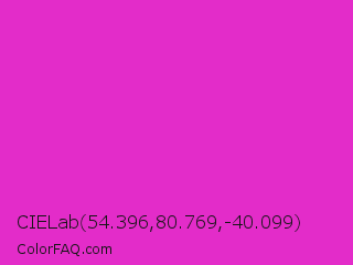 CIELab 54.396,80.769,-40.099 Color is a normal magenta color and the nearest color is Steel Pink #cc33cc. Hex code #e32cc9 and RGB value is rgb(227,44,201). In RGB color space, this color is composed of 89% red, 17% green, 79% blue, In CMYK color space, this color is composed of 0% cyan, 81% magenta, 11% yellow , 11% black , In HSL color space, this color has a hue angle of 309° , 77% saturation and 53% lightness.