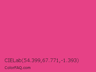 CIELab 54.399,67.771,-1.393 Color is a normal rose color and the nearest color is Cerise Pink #ec3b83. Hex code #e64187 and RGB value is rgb(230,65,135). In RGB color space, this color is composed of 90% red, 25% green, 53% blue, In CMYK color space, this color is composed of 0% cyan, 72% magenta, 41% yellow , 10% black , In HSL color space, this color has a hue angle of 335° , 77% saturation and 58% lightness.