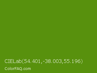 CIELab 54.401,-38.003,55.196 Color is a normal green color and the nearest color is Vida Loca #549019. Hex code #58910d and RGB value is rgb(88,145,13). In RGB color space, this color is composed of 35% red, 57% green, 5% blue, In CMYK color space, this color is composed of 39% cyan, 0% magenta, 91% yellow , 43% black , In HSL color space, this color has a hue angle of 86° , 84% saturation and 31% lightness.