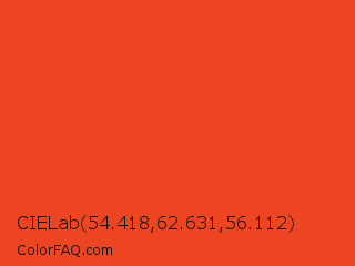 CIELab 54.418,62.631,56.112 Color is a normal red color and the nearest color is Pomegranate #f34723. Hex code #ed4521 and RGB value is rgb(237,69,33). In RGB color space, this color is composed of 93% red, 27% green, 13% blue, In CMYK color space, this color is composed of 0% cyan, 71% magenta, 86% yellow , 7% black , In HSL color space, this color has a hue angle of 11° , 85% saturation and 53% lightness.
