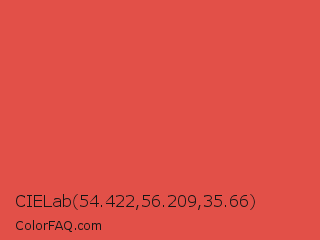 CIELab 54.422,56.209,35.66 Color is a normal red color and the nearest color is Carmine Pink #eb4c42. Hex code #e25048 and RGB value is rgb(226,80,72). In RGB color space, this color is composed of 89% red, 31% green, 28% blue, In CMYK color space, this color is composed of 0% cyan, 65% magenta, 68% yellow , 11% black , In HSL color space, this color has a hue angle of 3° , 73% saturation and 58% lightness.