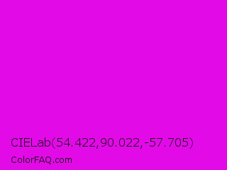 CIELab 54.422,90.022,-57.705 Color is a normal magenta color and the nearest color is Phlox #df00ff. Hex code #e30ae8 and RGB value is rgb(227,10,232). In RGB color space, this color is composed of 89% red, 4% green, 91% blue, In CMYK color space, this color is composed of 2% cyan, 96% magenta, 0% yellow , 9% black , In HSL color space, this color has a hue angle of 299° , 92% saturation and 47% lightness.