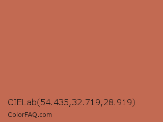 CIELab 54.435,32.719,28.919 Color is a normal red color and the nearest color is Copper Red #cb6d51. Hex code #c26a52 and RGB value is rgb(194,106,82). In RGB color space, this color is composed of 76% red, 42% green, 32% blue, In CMYK color space, this color is composed of 0% cyan, 45% magenta, 58% yellow , 24% black , In HSL color space, this color has a hue angle of 13° , 48% saturation and 54% lightness.