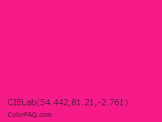 CIELab 54.442,81.21,-2.761 Color is a normal rose color and the nearest color is Fluorescent Pink #ff1493. Hex code #f71b8a and RGB value is rgb(247,27,138). In RGB color space, this color is composed of 97% red, 11% green, 54% blue, In CMYK color space, this color is composed of 0% cyan, 89% magenta, 44% yellow , 3% black , In HSL color space, this color has a hue angle of 330° , 93% saturation and 54% lightness.