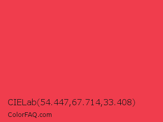 CIELab 54.447,67.714,33.408 Color is a normal red color and the nearest color is Desire #ea3c53. Hex code #f03d4d and RGB value is rgb(240,61,77). In RGB color space, this color is composed of 94% red, 24% green, 30% blue, In CMYK color space, this color is composed of 0% cyan, 75% magenta, 68% yellow , 6% black , In HSL color space, this color has a hue angle of 355° , 86% saturation and 59% lightness.