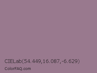 CIELab 54.449,16.087,-6.629 Color is a normal magenta color and the nearest color is Mountbatten Pink #997a8d. Hex code #99798e and RGB value is rgb(153,121,142). In RGB color space, this color is composed of 60% red, 47% green, 56% blue, In CMYK color space, this color is composed of 0% cyan, 21% magenta, 7% yellow , 40% black , In HSL color space, this color has a hue angle of 321° , 14% saturation and 54% lightness.