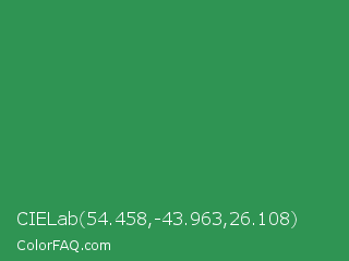 CIELab 54.458,-43.963,26.108 Color is a normal green color and the nearest color is Sea Green #2e8b57. Hex code #2f9453 and RGB value is rgb(47,148,83). In RGB color space, this color is composed of 18% red, 58% green, 33% blue, In CMYK color space, this color is composed of 68% cyan, 0% magenta, 44% yellow , 42% black , In HSL color space, this color has a hue angle of 141° , 52% saturation and 38% lightness.
