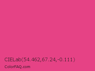 CIELab 54.462,67.24,-0.111 Color is a normal rose color and the nearest color is Cerise Pink #ec3b83. Hex code #e64285 and RGB value is rgb(230,66,133). In RGB color space, this color is composed of 90% red, 26% green, 52% blue, In CMYK color space, this color is composed of 0% cyan, 71% magenta, 42% yellow , 10% black , In HSL color space, this color has a hue angle of 335° , 77% saturation and 58% lightness.