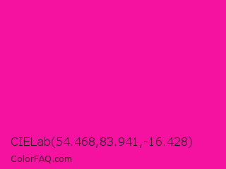 CIELab 54.468,83.941,-16.428 Color is a normal magenta color and the nearest color is Fluorescent Pink #ff1493. Hex code #f512a1 and RGB value is rgb(245,18,161). In RGB color space, this color is composed of 96% red, 7% green, 63% blue, In CMYK color space, this color is composed of 0% cyan, 93% magenta, 34% yellow , 4% black , In HSL color space, this color has a hue angle of 322° , 92% saturation and 52% lightness.