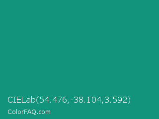 CIELab 54.476,-38.104,3.592 Color is a normal cyan color and the nearest color is Gossamer #069b81. Hex code #12937b and RGB value is rgb(18,147,123). In RGB color space, this color is composed of 7% red, 58% green, 48% blue, In CMYK color space, this color is composed of 88% cyan, 0% magenta, 16% yellow , 42% black , In HSL color space, this color has a hue angle of 169° , 78% saturation and 32% lightness.