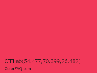 CIELab 54.477,70.399,26.482 Color is a normal red color and the nearest color is Desire #ea3c53. Hex code #f23859 and RGB value is rgb(242,56,89). In RGB color space, this color is composed of 95% red, 22% green, 35% blue, In CMYK color space, this color is composed of 0% cyan, 77% magenta, 63% yellow , 5% black , In HSL color space, this color has a hue angle of 349° , 88% saturation and 58% lightness.