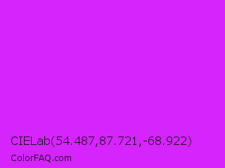 CIELab 54.487,87.721,-68.922 Color is a normal purple color and the nearest color is Vivid Orchid #cc00ff. Hex code #d524fc and RGB value is rgb(213,36,252). In RGB color space, this color is composed of 84% red, 14% green, 99% blue, In CMYK color space, this color is composed of 15% cyan, 86% magenta, 0% yellow , 1% black , In HSL color space, this color has a hue angle of 289° , 97% saturation and 56% lightness.