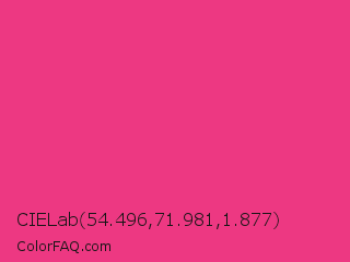 CIELab 54.496,71.981,1.877 Color is a normal rose color and the nearest color is Cerise Pink #ec3b83. Hex code #ed3882 and RGB value is rgb(237,56,130). In RGB color space, this color is composed of 93% red, 22% green, 51% blue, In CMYK color space, this color is composed of 0% cyan, 76% magenta, 45% yellow , 7% black , In HSL color space, this color has a hue angle of 335° , 83% saturation and 57% lightness.