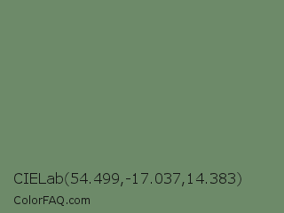 CIELab 54.499,-17.037,14.383 Color is a normal green color and the nearest color is Highland #6f8e63. Hex code #6d8a69 and RGB value is rgb(109,138,105). In RGB color space, this color is composed of 43% red, 54% green, 41% blue, In CMYK color space, this color is composed of 21% cyan, 0% magenta, 24% yellow , 46% black , In HSL color space, this color has a hue angle of 113° , 14% saturation and 48% lightness.