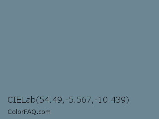 CIELab 54.49,-5.567,-10.439 Color is a normal blue color and the nearest color is Slate Gray #708090. Hex code #6d8694 and RGB value is rgb(109,134,148). In RGB color space, this color is composed of 43% red, 53% green, 58% blue, In CMYK color space, this color is composed of 26% cyan, 9% magenta, 0% yellow , 42% black , In HSL color space, this color has a hue angle of 202° , 15% saturation and 50% lightness.